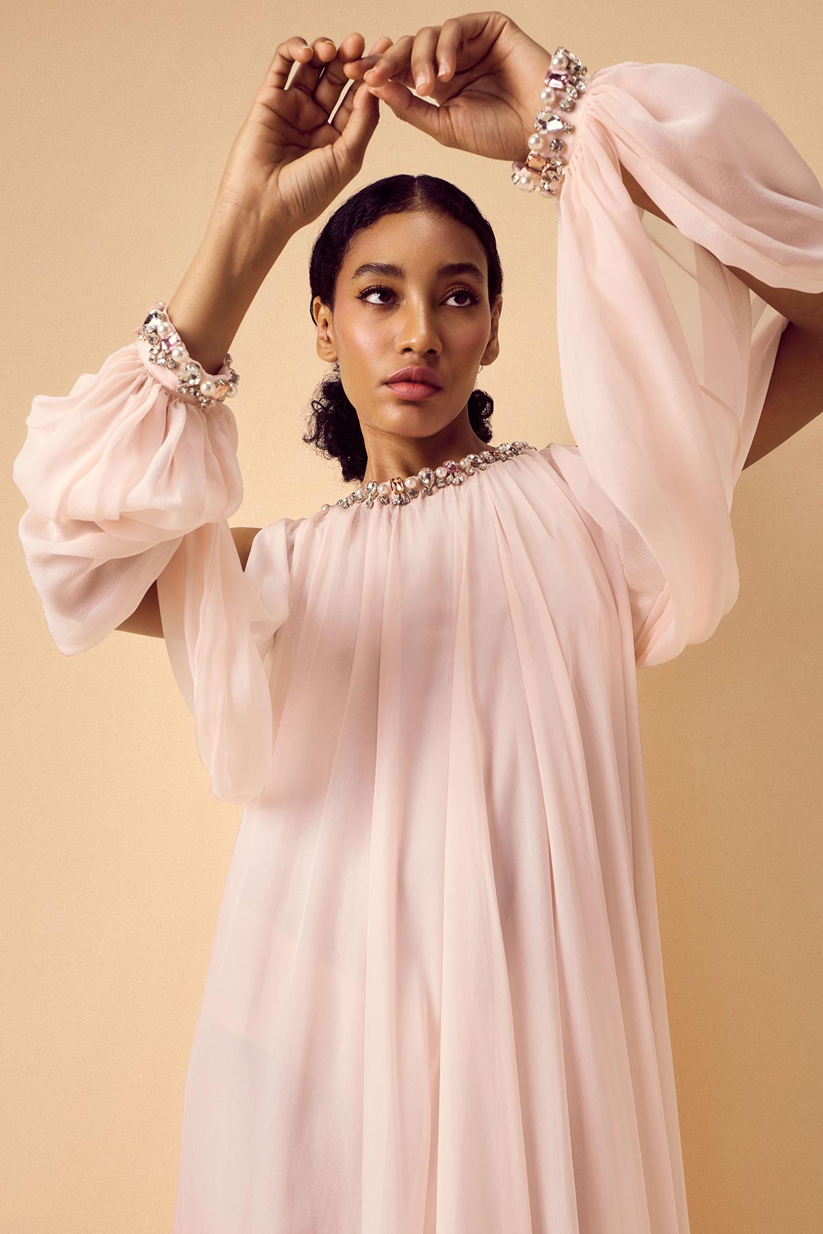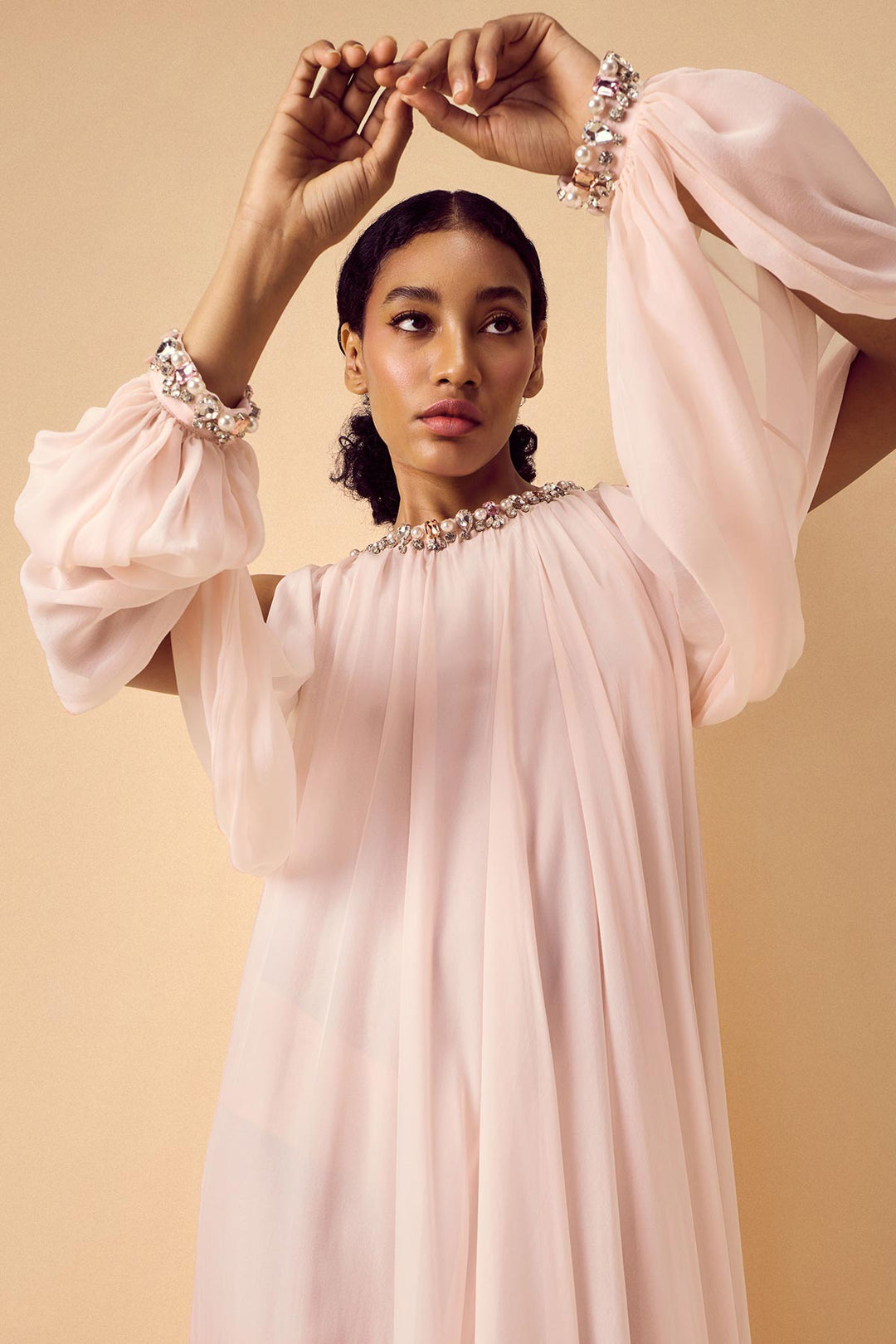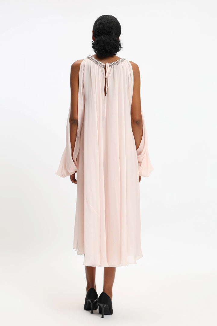 Flowing Chiffon Dress with Slit Sleeves Accentuated with Crystals and Pearls on The Neckline and Cuffs.