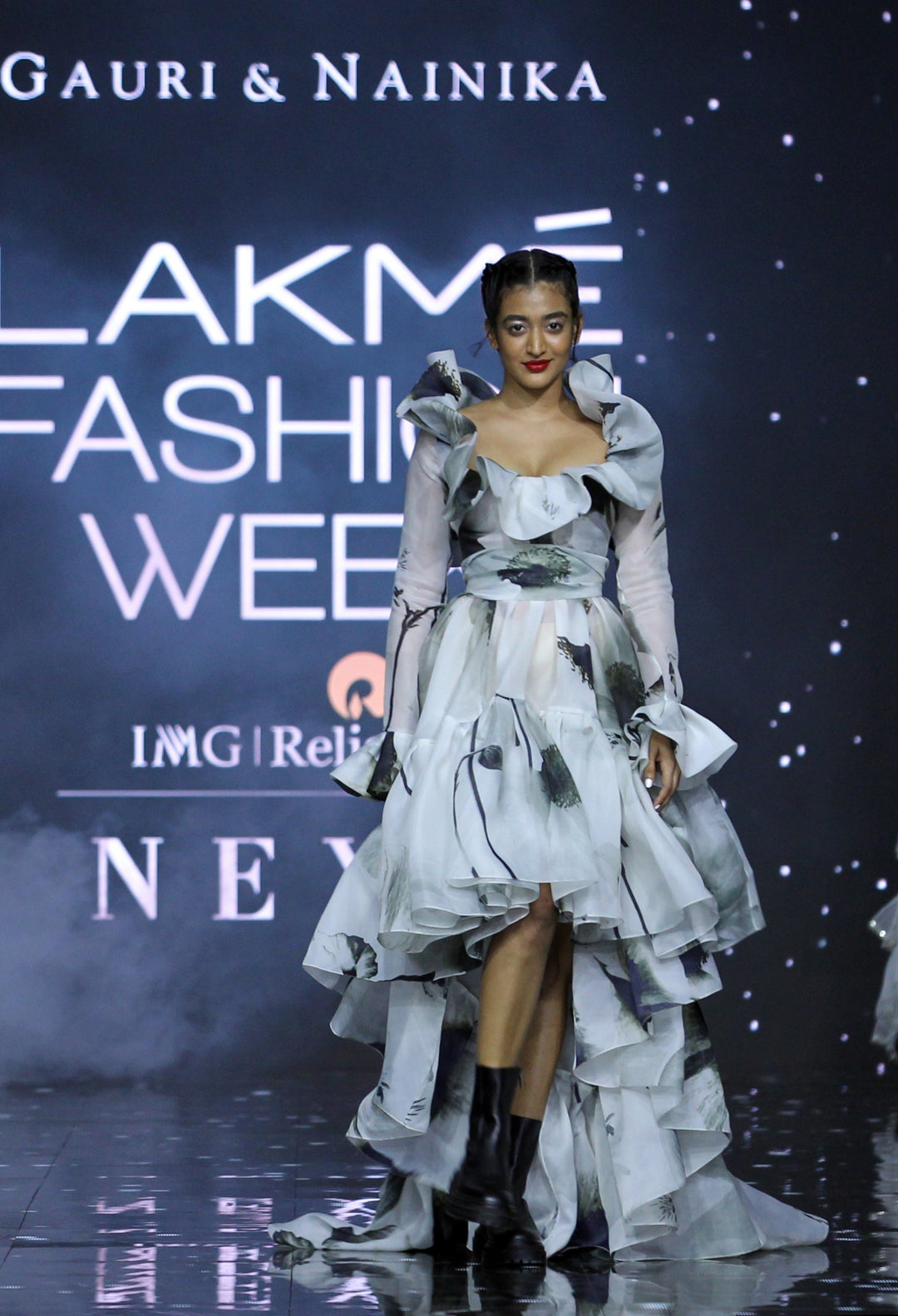 Full sleeves high low dress with bubble ruffle detailing on neck