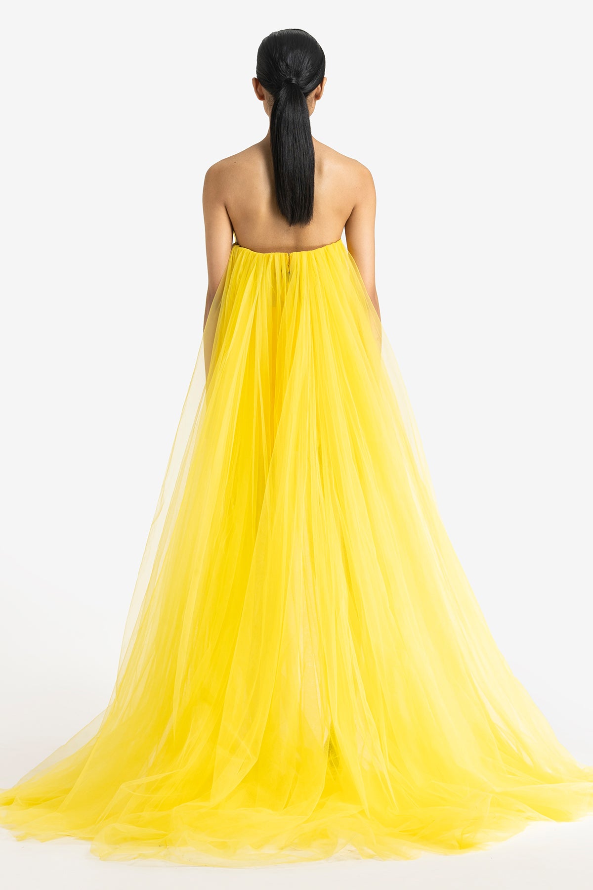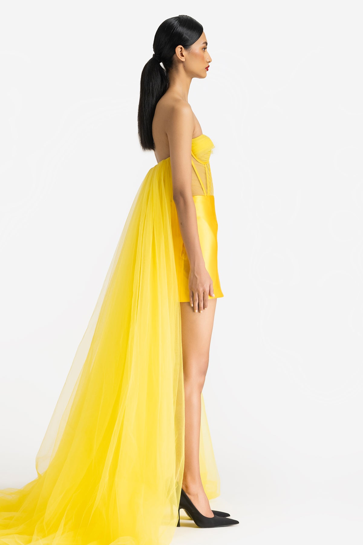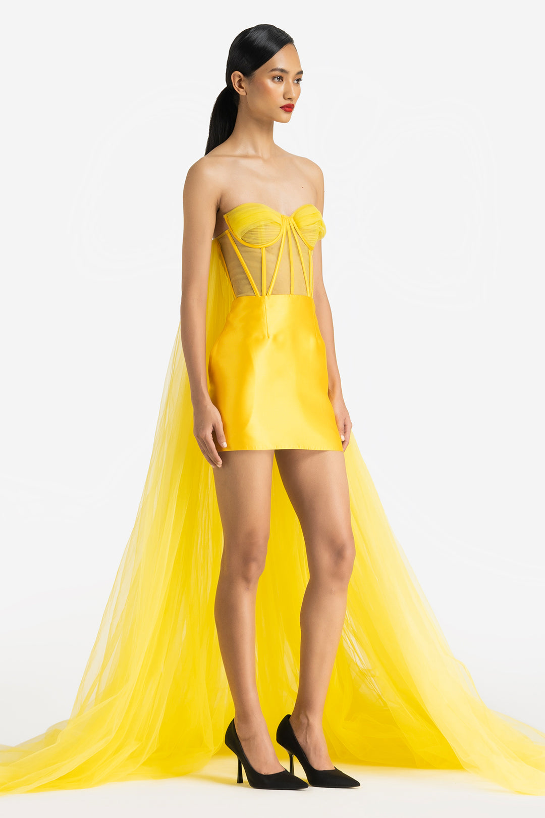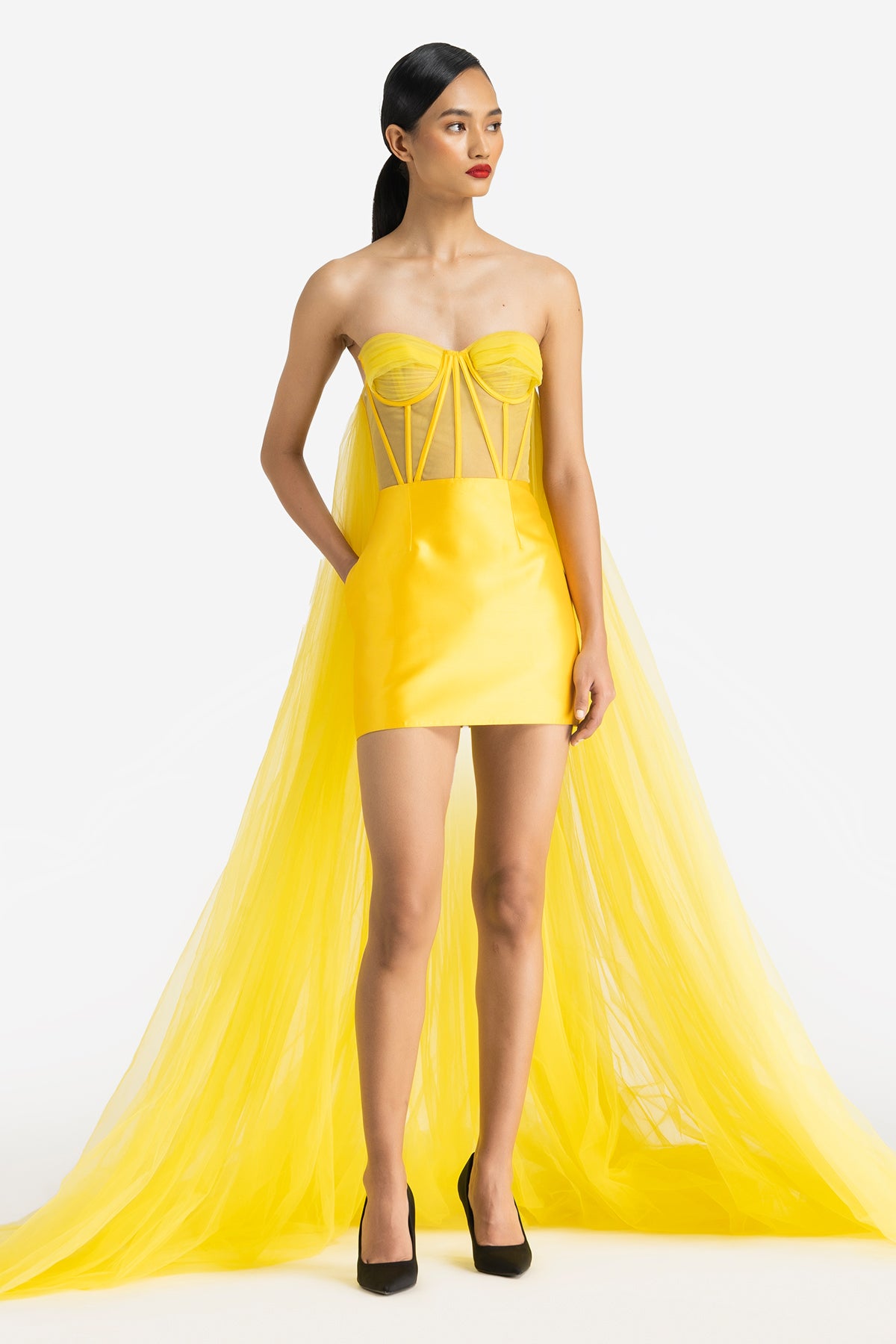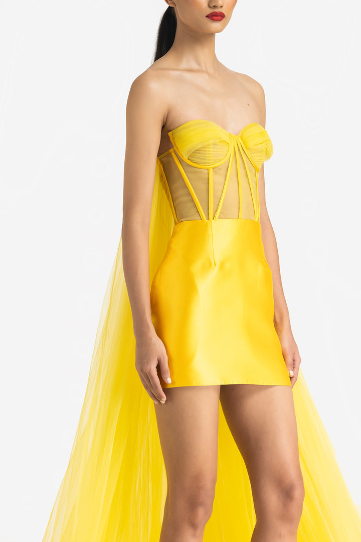Strapless Corset Mini Dress with Extended Detachable Trail and Side Pockets