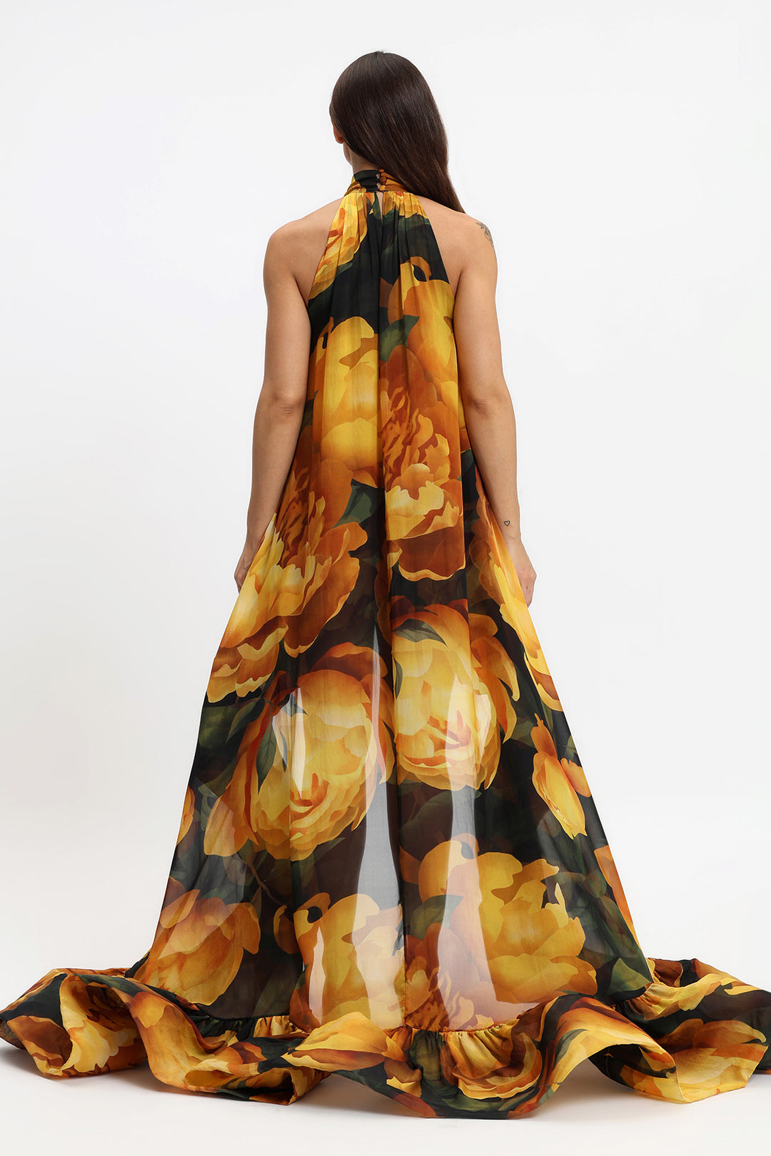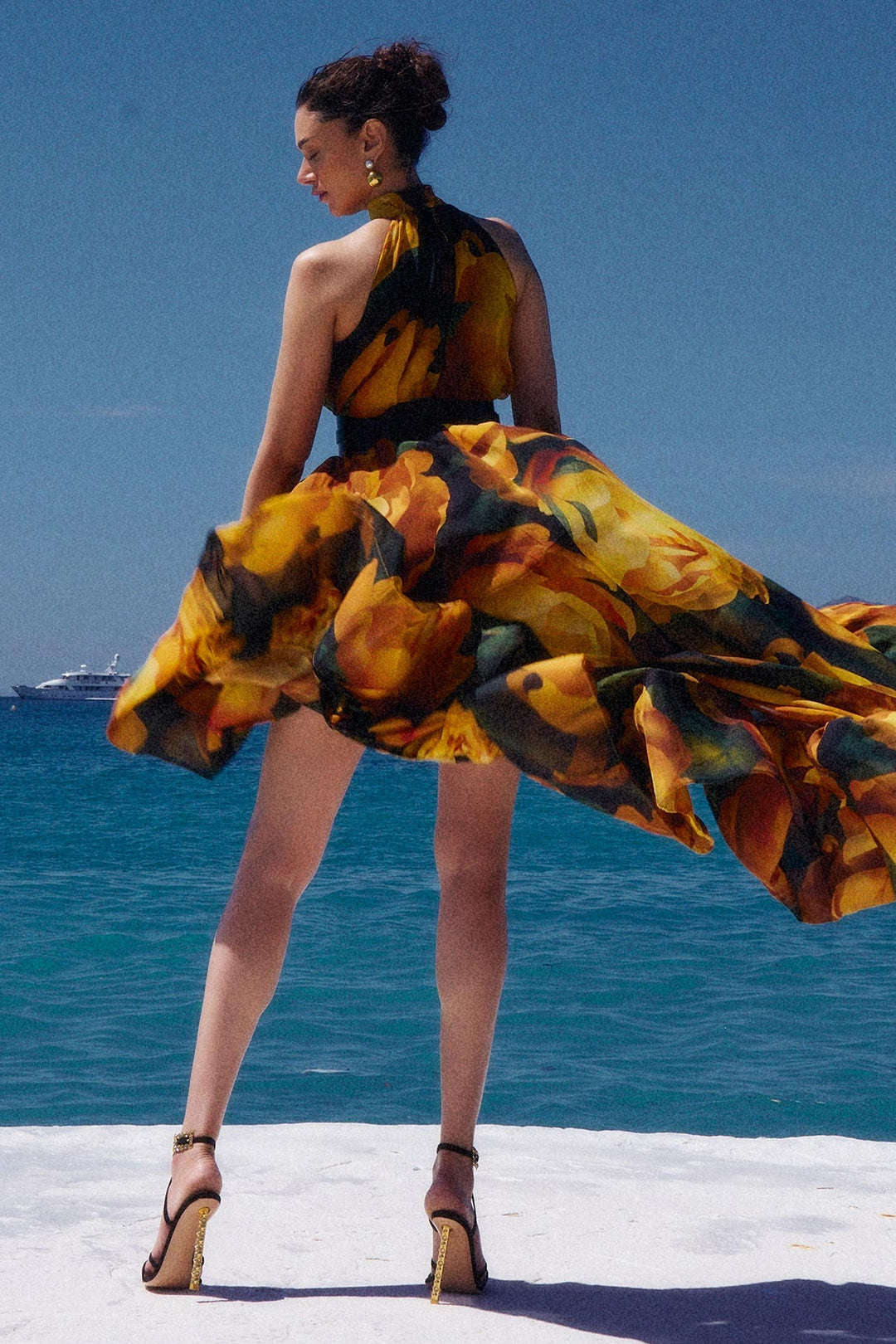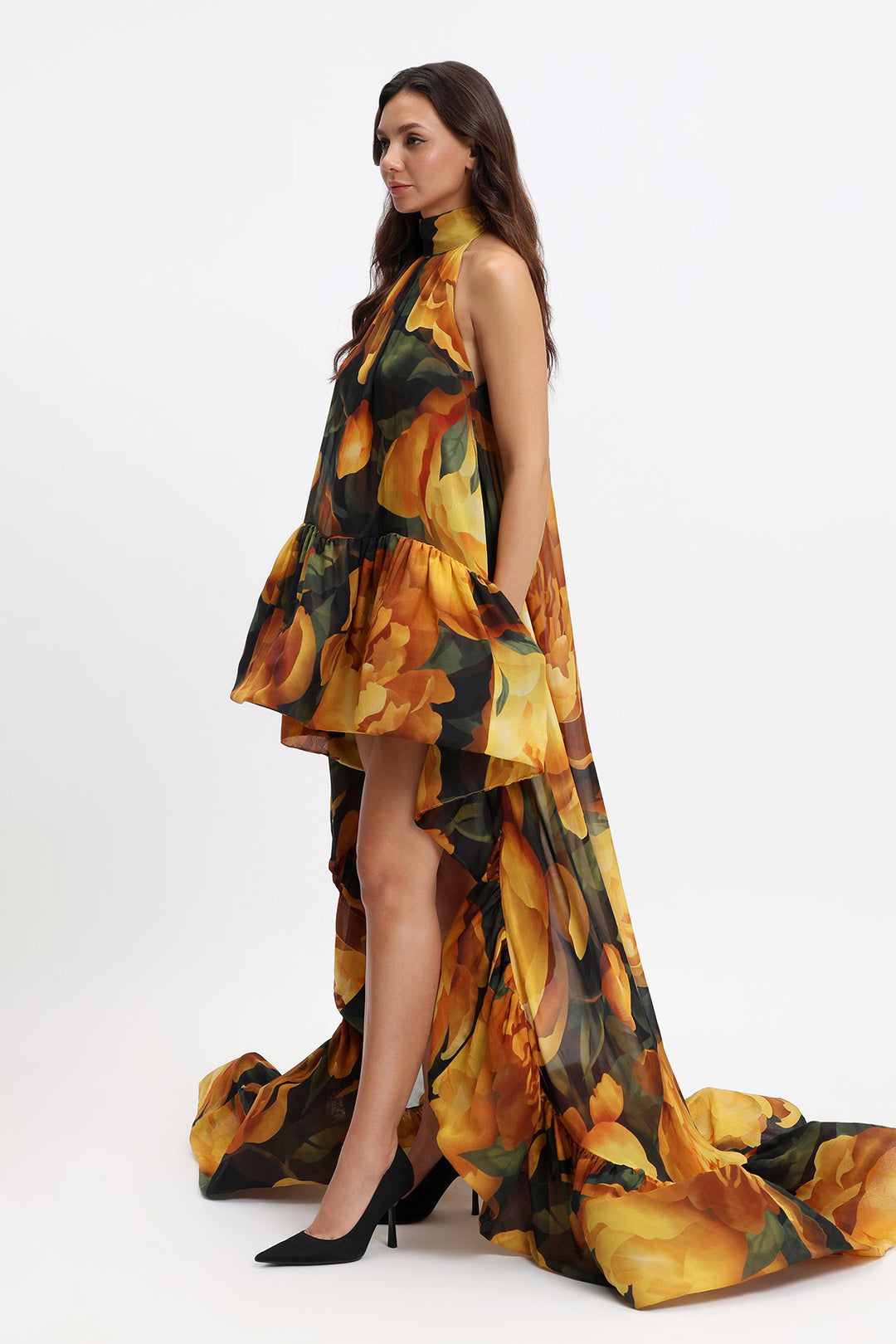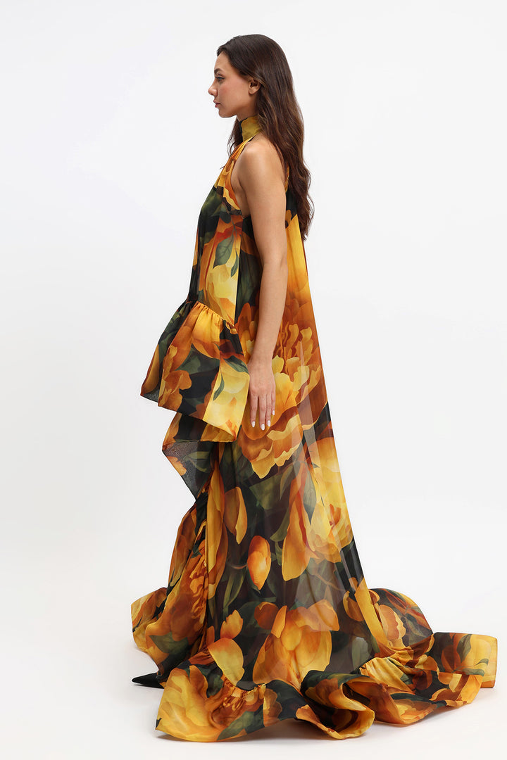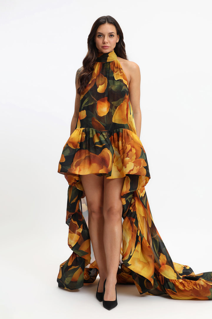 Hlater Neck Chiffon High-Low Dress with Ruffled Horsehair Border.
