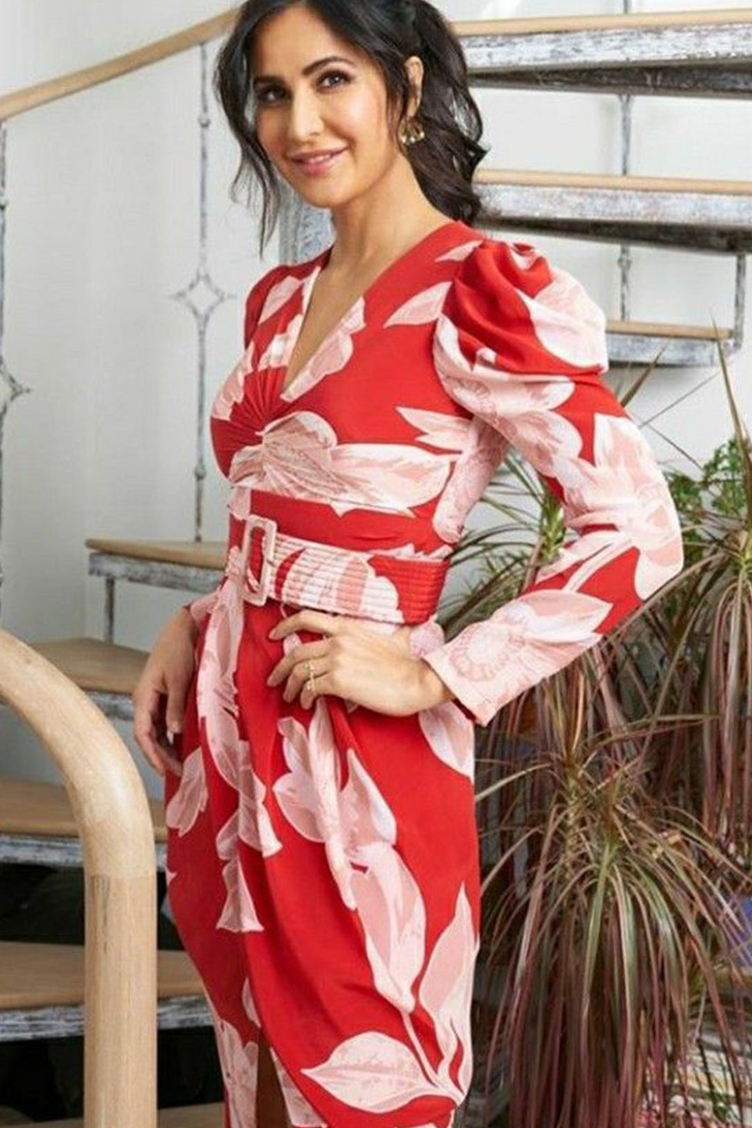 Deep V-Neck High-Low Hem Dress with Front Slit and Pouf Sleeves