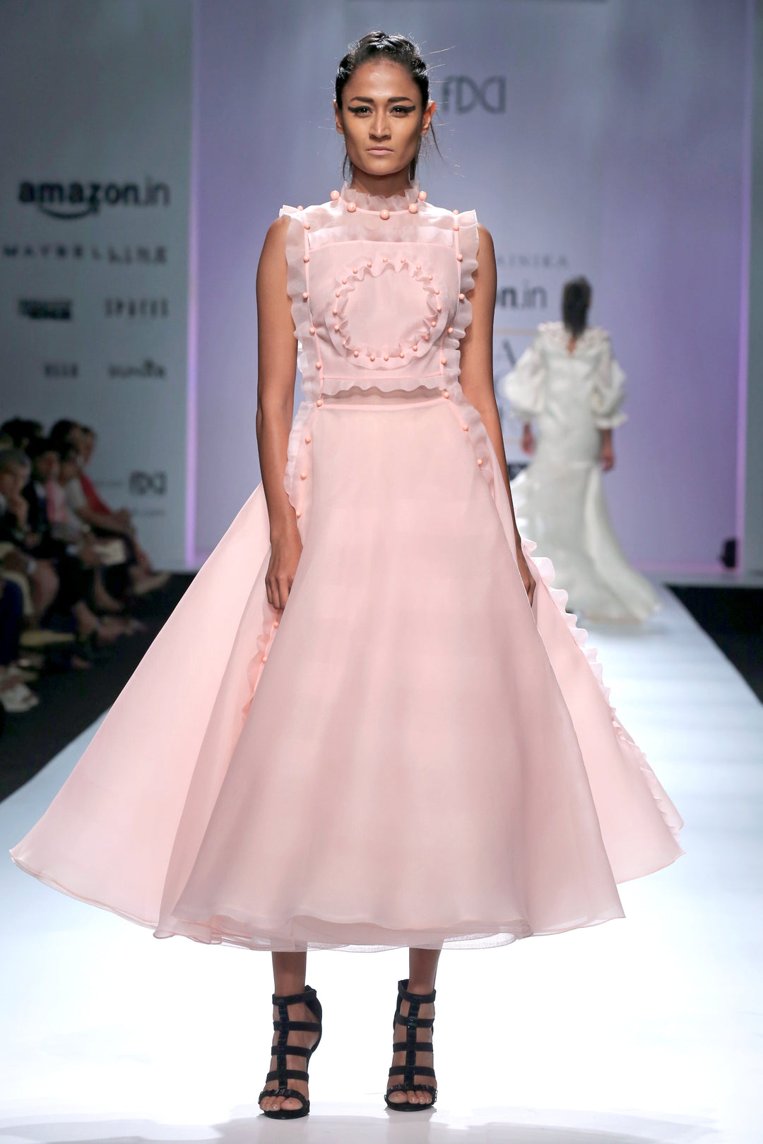 Mid waisted and flared sleeveless midi dress with frill and pearl texturing