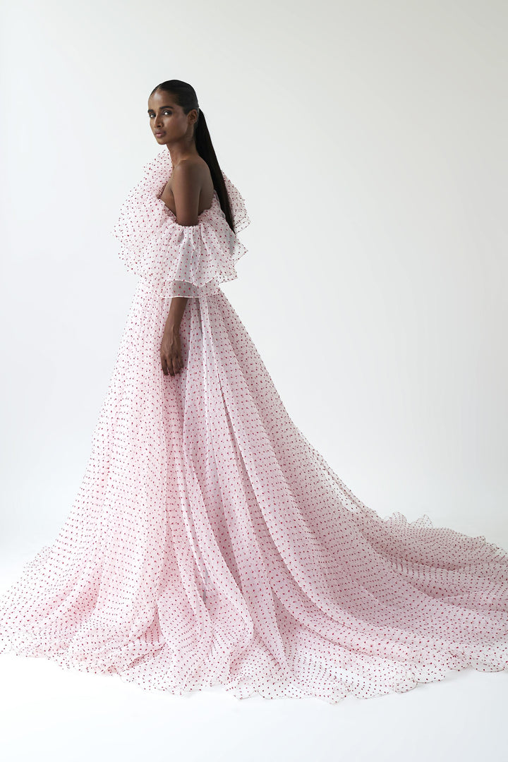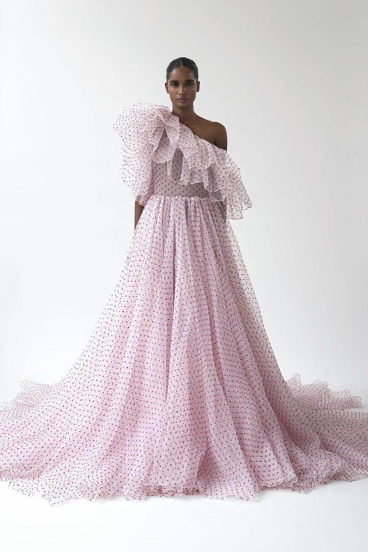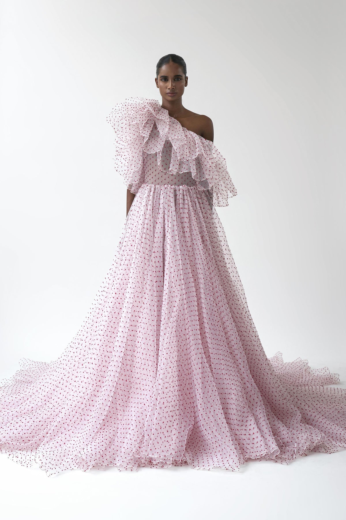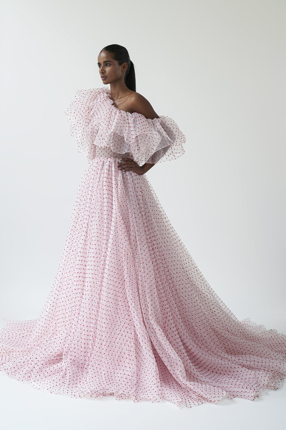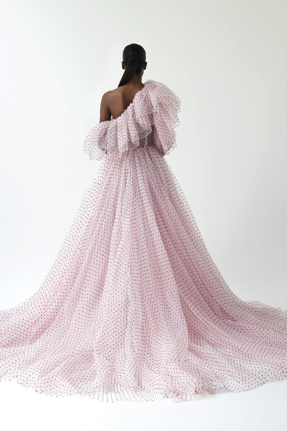 One shoulder gown with ruffled upper body and cold shoulder sleeves