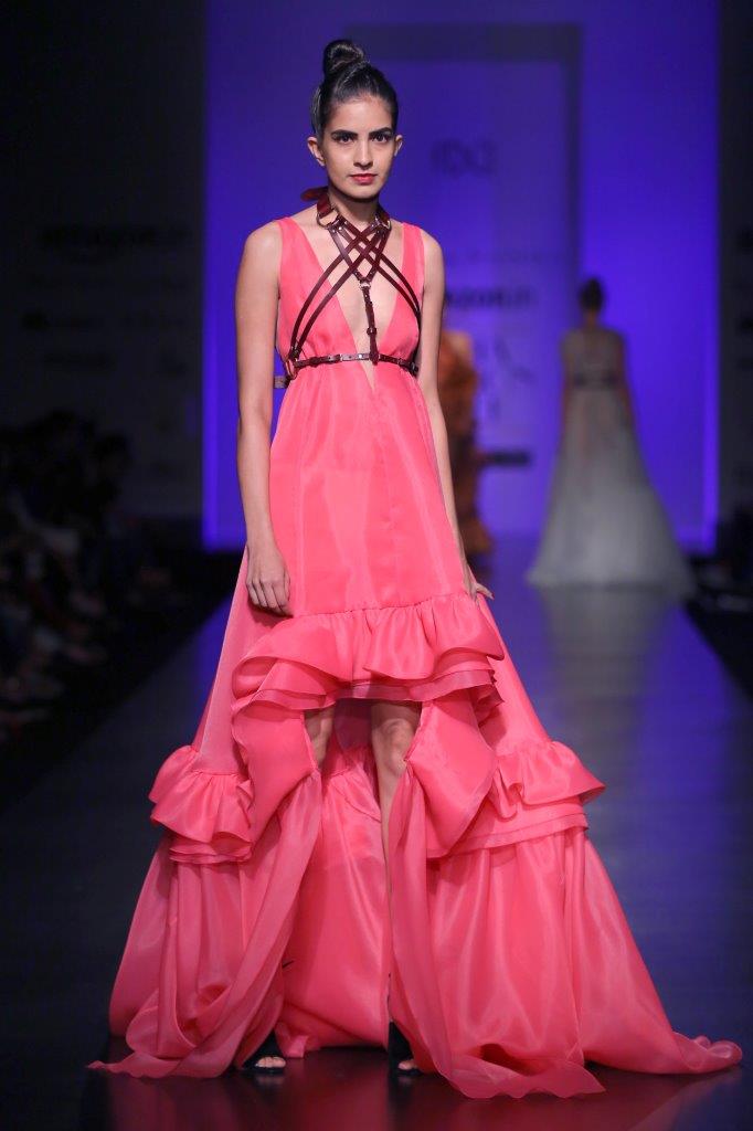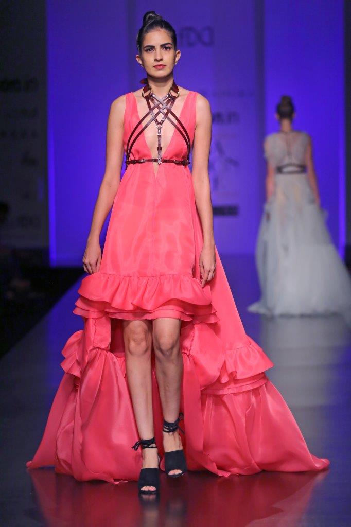Plunge neck trapeze gown with high low square cut out