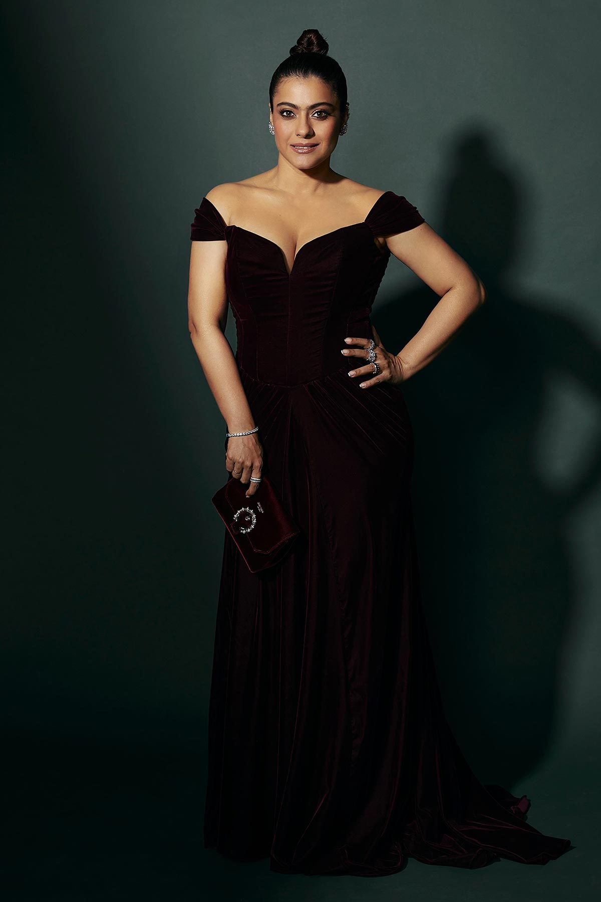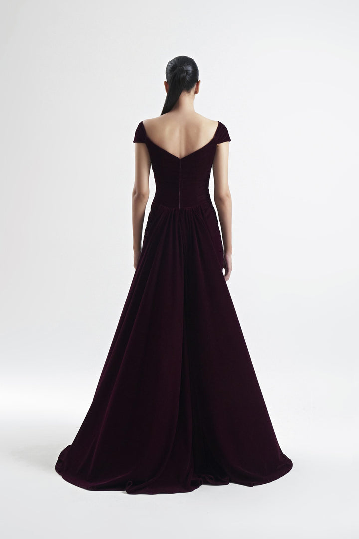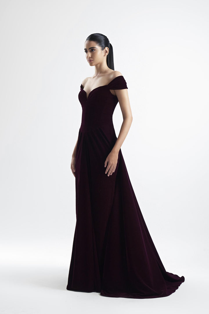 Plunging V- neck drop waist mermaid gown with off shoulder drapes