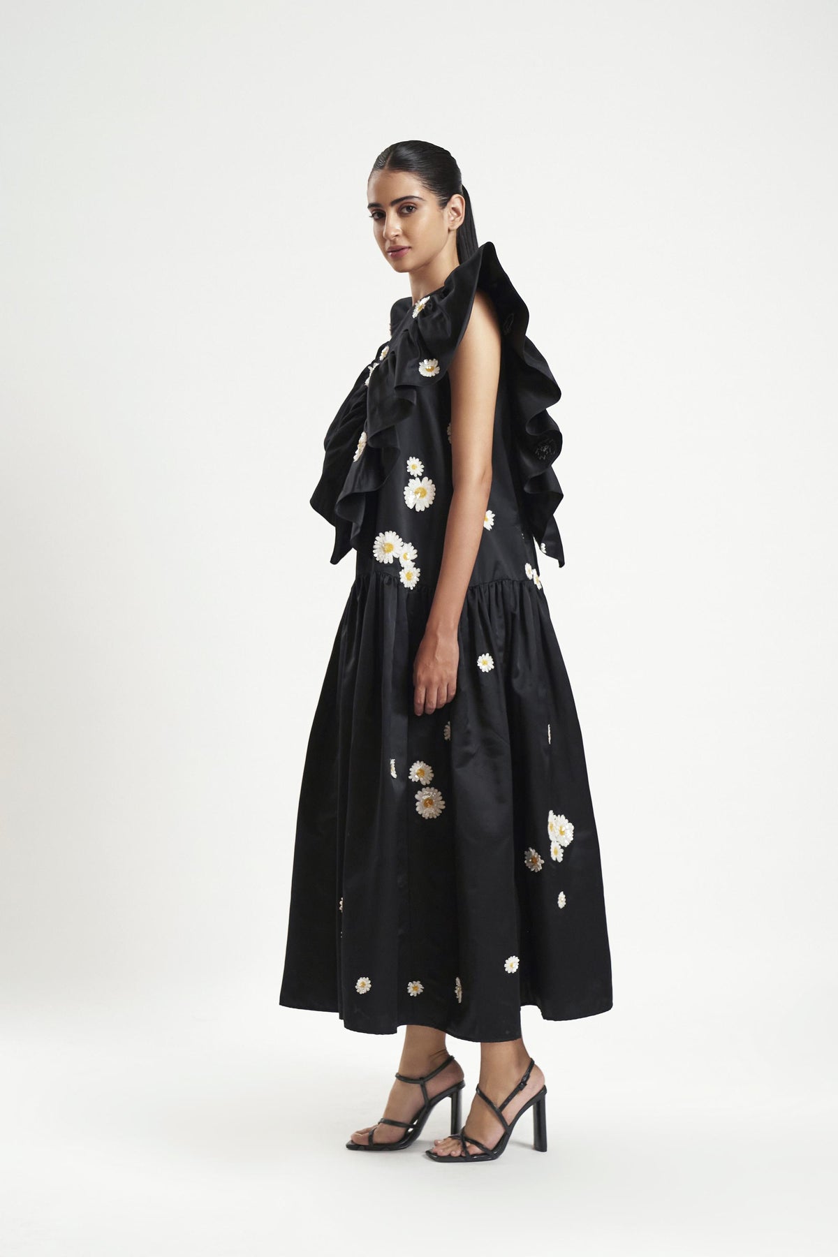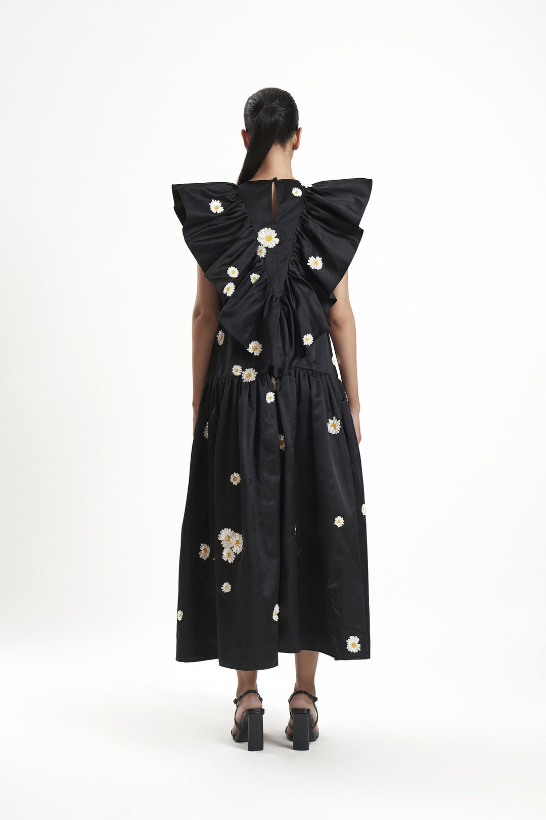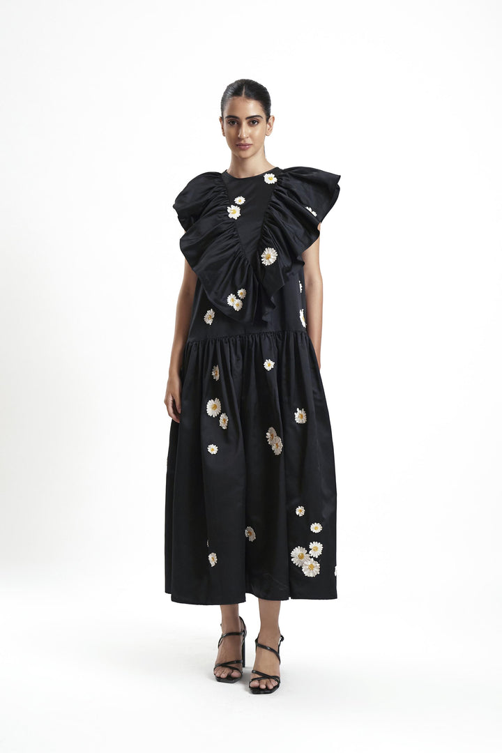 Ruffled neck and drop waist cut shift maxi dress with daisy embroidery