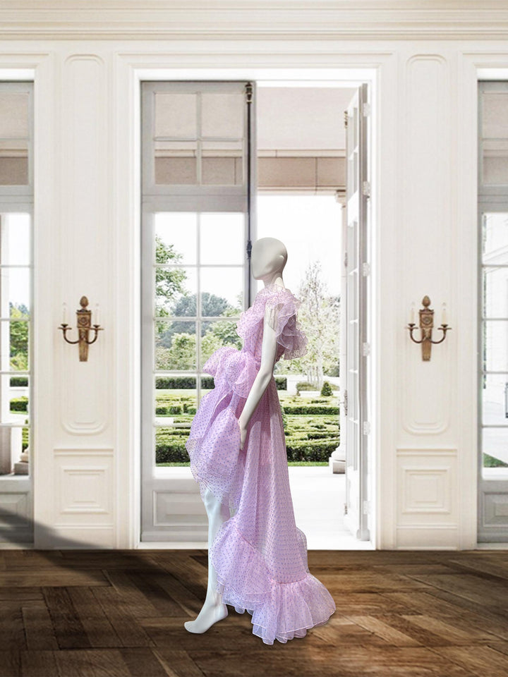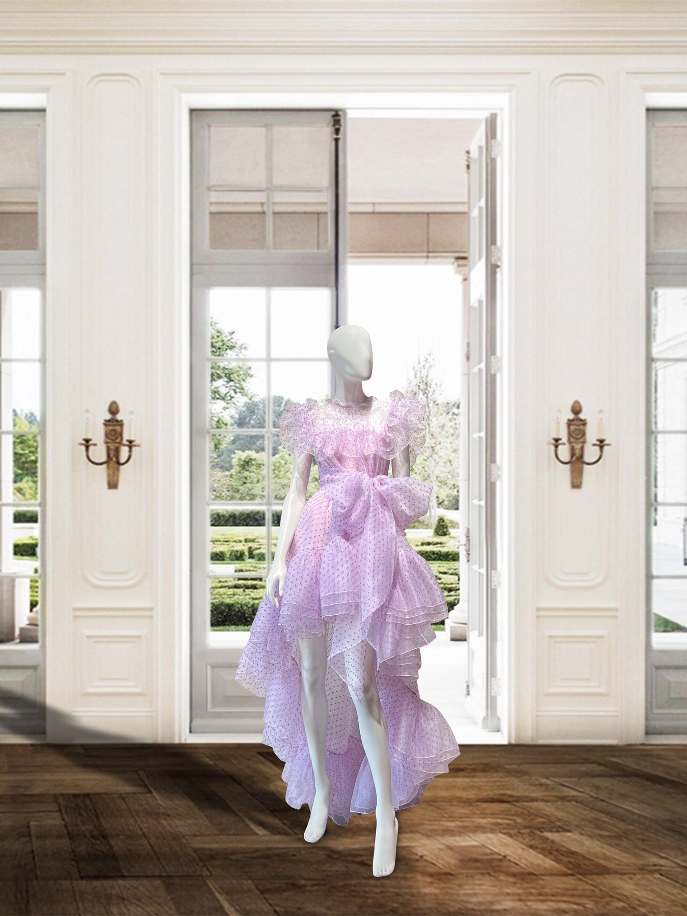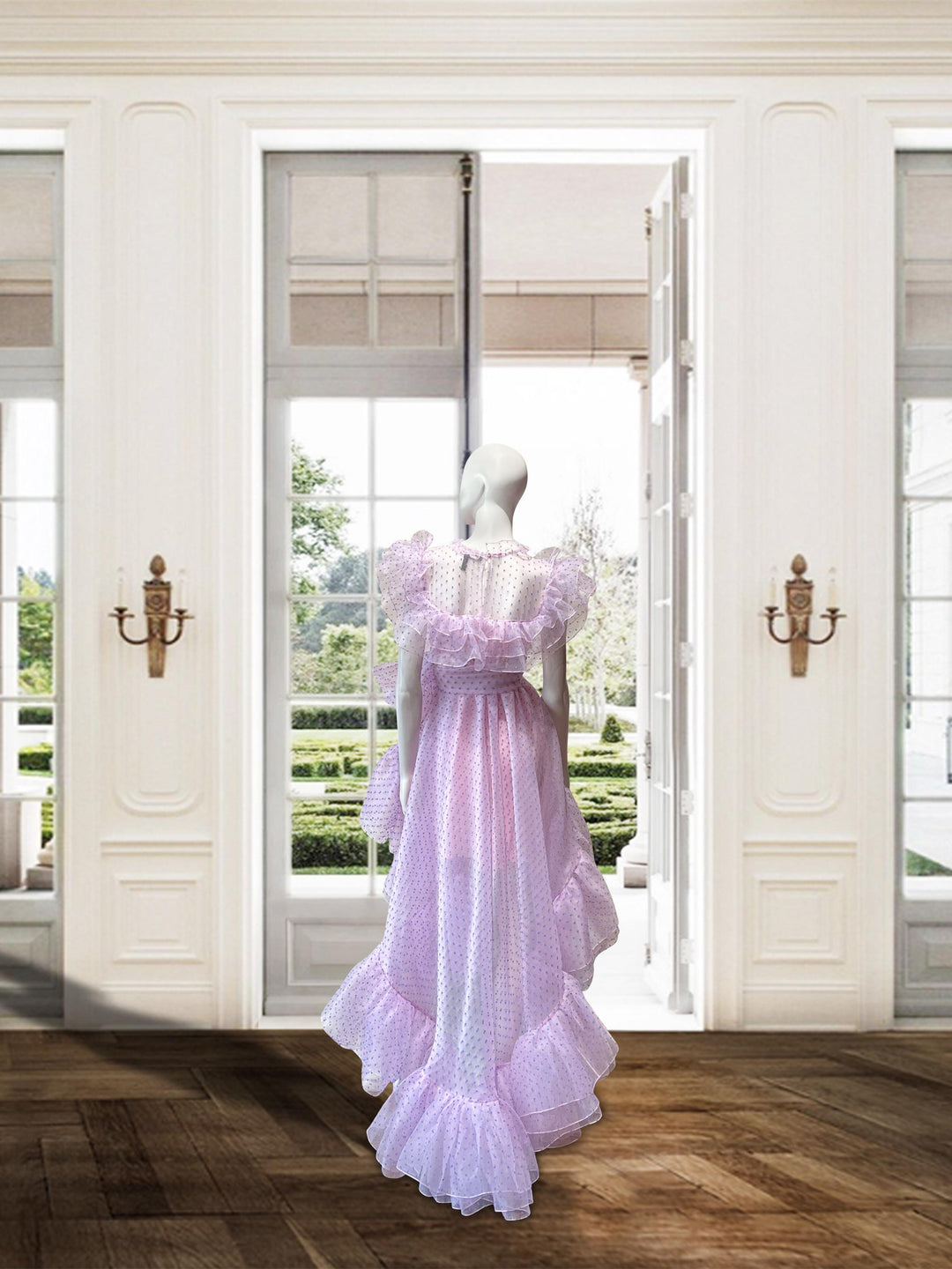 Sheer square neck ruffled high low Anjali dress in plumetis organza