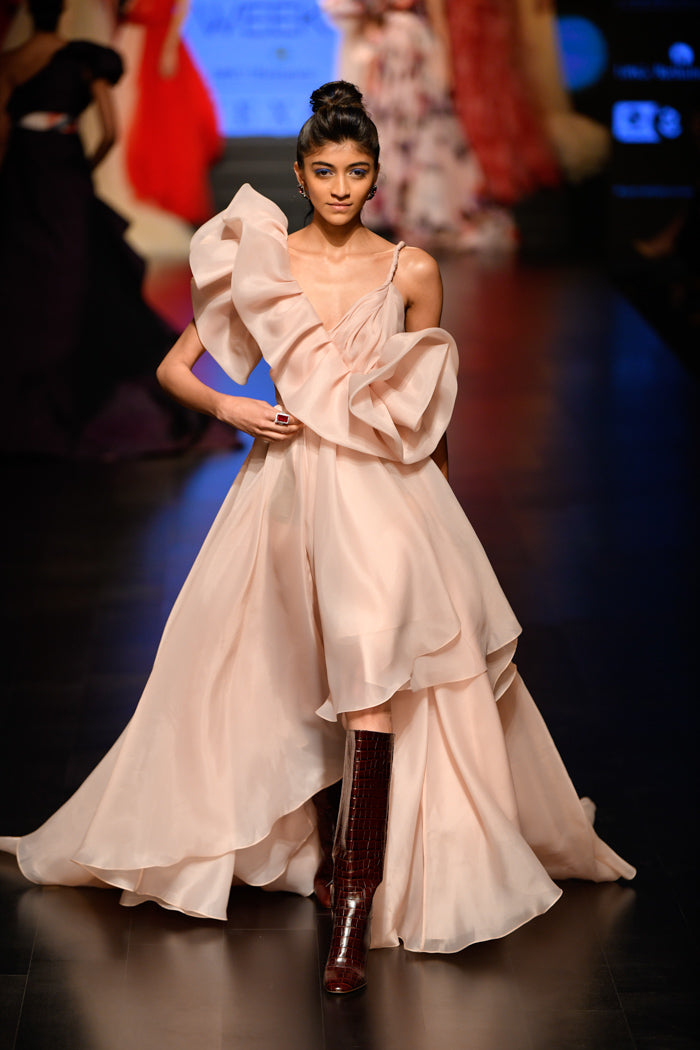 Twisted strap high low dress with bubble ruffle frills and flower on waist