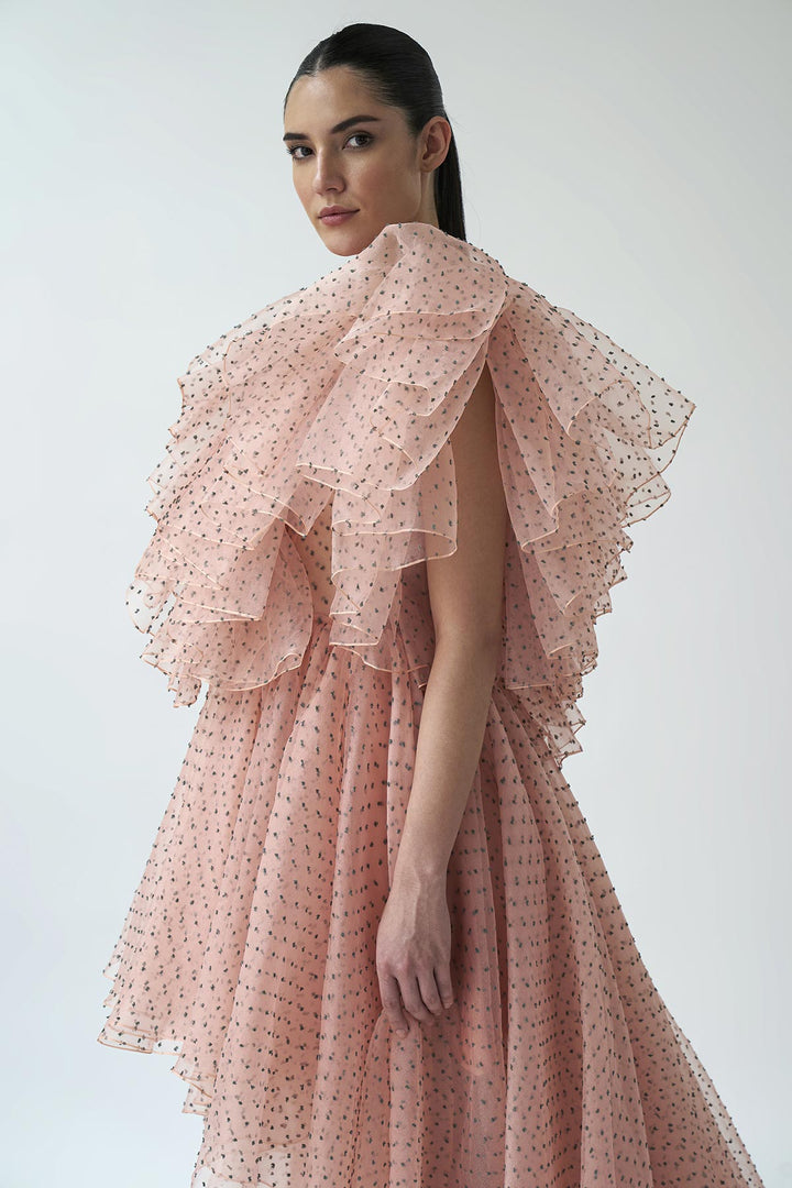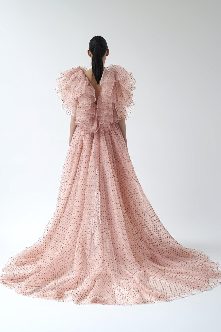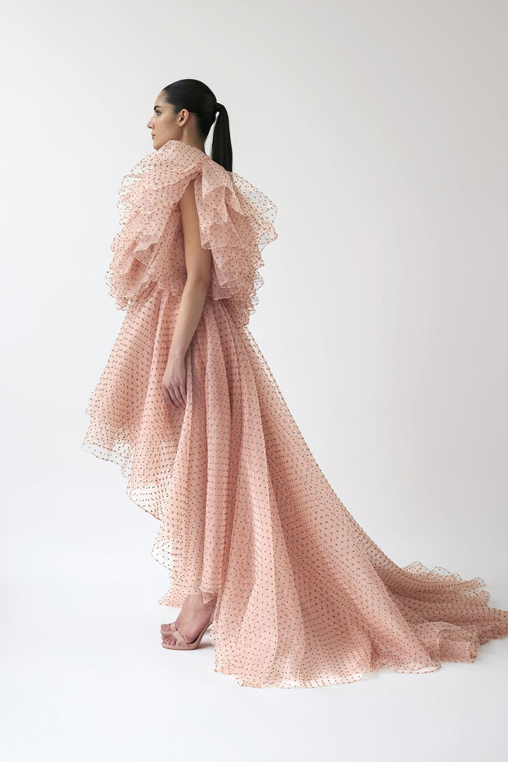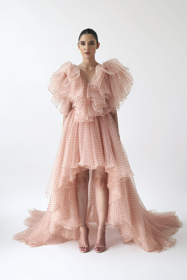 V neck high low gown with dramatic frill detailing in plumetis organza