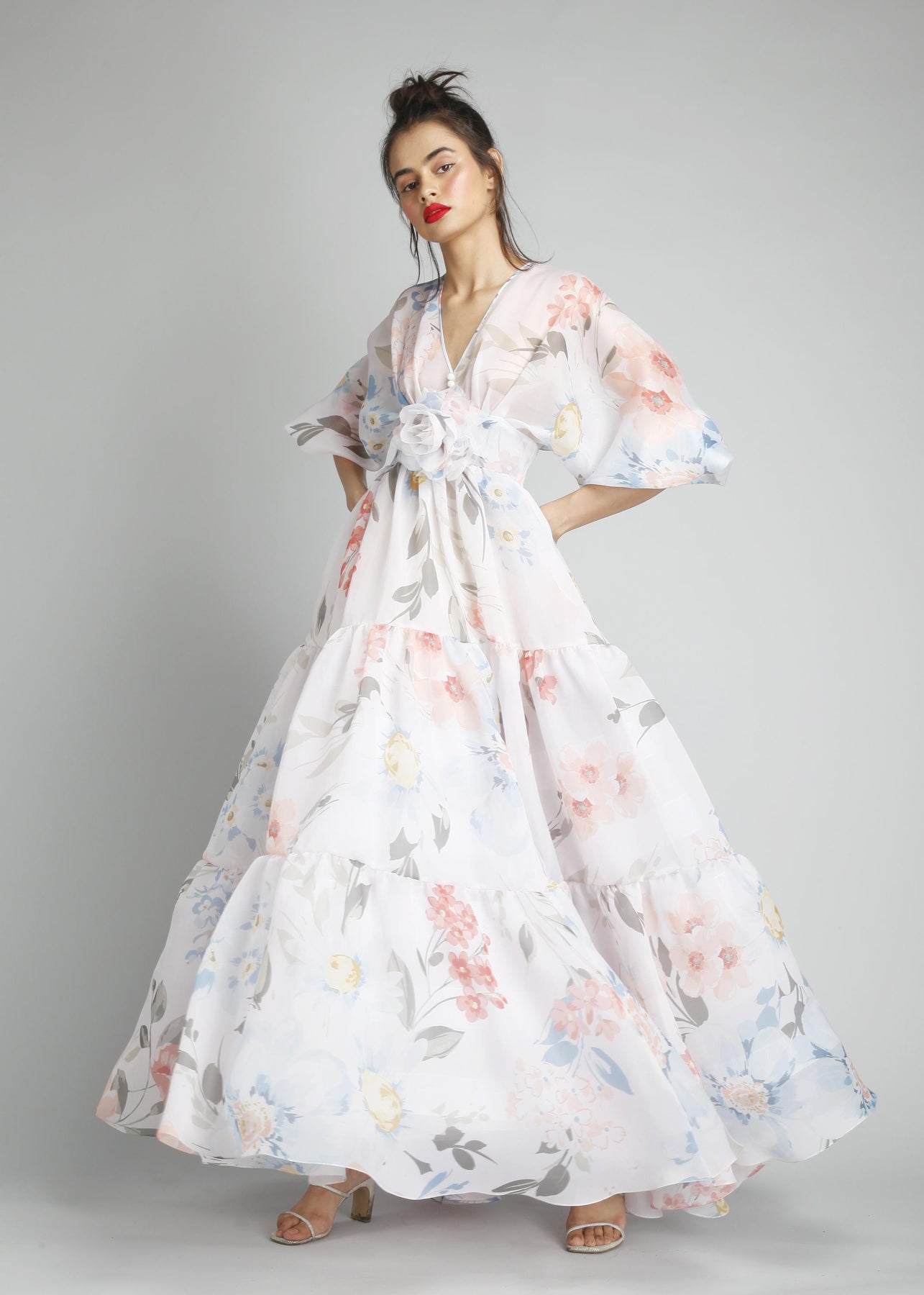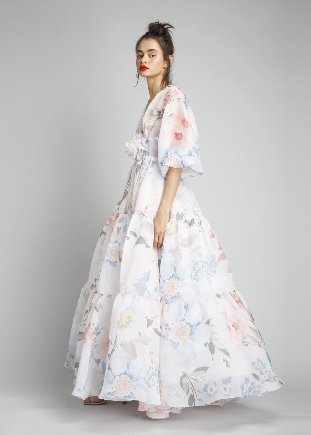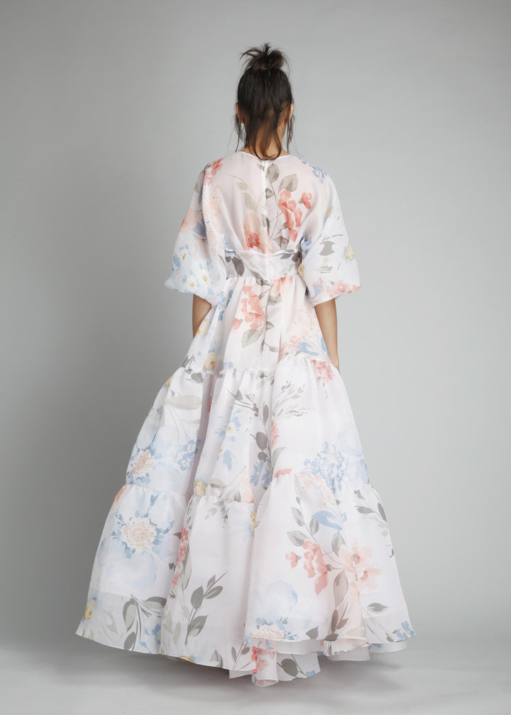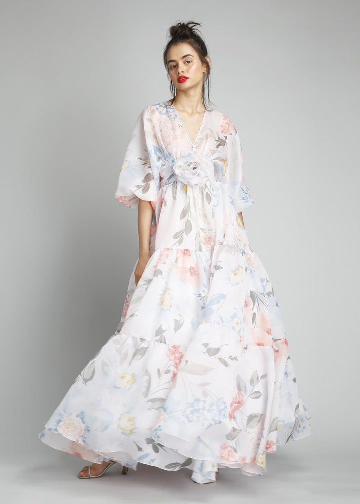 V-Neck Pouf Sleeves Peasant Cut Maxi Gown